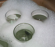 Dishwashing liquid (BrE: washing-up liquid), known as dishwashing soap, dish detergent and dish soap, is a detergent used to assist in dishwashing. It is usually a highly-foaming mixture of surfactants with low skin irritation, and is primarily used for hand washing of glasses, plates, cutlery, and cooking utensils in a sink or bowl. In addition to its primary use, dishwashing liquid also has various informal applications, such as for creating bubbles, clothes washing and cleaning oil-affected birds.