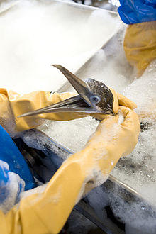 - Dishwashing liquid has been used to treat birds affected by oil spills.[37][38] After the Exxon Valdez oil spill in 1989, the International Bird Rescue Research Center received hundreds of cases of dishwashing liquid that were used for this purpose.[39][40][41] More dishwashing liquid was donated during the Deepwater Horizon oil spill to the International Bird Rescue Research Center and the Marine Mammal Center.[42]