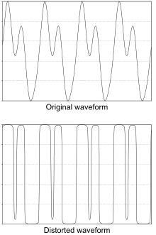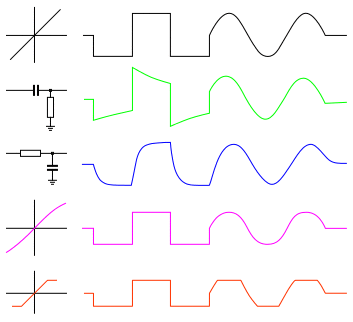 Distortion is the alteration of the original shape (or other characteristic) of something. In communications and electronics it means the alteration of the waveform of an information-bearing signal, such as an audio signal representing sound or a video signal representing images, in an electronic device or communication channel.