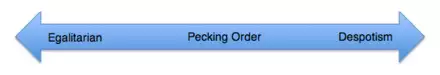 The manifestation of intrasexual conflict can be observed in one of two systems. The social order can be either egalitarian or despotic. In a linear ranking system (often referred to as a pecking order), every member of the gender is recognized as either dominant or submissive relative to every other member, creating a linear distribution of rank. For example, groups of spotted hyenas and brown hyenas both demonstrate linear dominance.[63] In a despotic system, one or two members are considered dominant while all other members of the living group are equally submissive. Examples of despotic social systems are found in leopard geckos, dwarf hamsters, gorillas, Neolamprologus pulcher, and African wild dog.[64]
