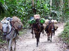 The first donkeys came to the Americas on ships of the Second Voyage of Christopher Columbus, and were landed at Hispaniola in 1495.[35] The first to reach North America may have been two animals taken to Mexico by Juan de Zumárraga, the first bishop of Mexico, who arrived there on 6 December 1528, while the first donkeys to reach what is now the United States may have crossed the Rio Grande with Juan de Oñate in April 1598.[36] From that time on they spread northward, finding use in missions and mines. Donkeys were documented as present in what today is Arizona in 1679. By the Gold Rush years of the 19th century, the burro was the beast of burden of choice of early prospectors in the western United States. With the end of the placer mining boom, many of them escaped or were abandoned, and a feral population established itself.