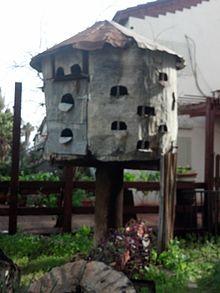 A dovecote or dovecot /ˈdʌvkɒt/, doocot (Scots) or columbarium is a structure intended to house pigeons or doves.[1] Dovecotes may be free-standing structures in a variety of shapes, or built into the end of a house or barn. They generally contain pigeonholes for the birds to nest.[2] Pigeons and doves were an important food source historically in the Middle East and Europe and were kept for their eggs and dung.[3]