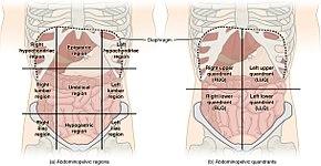 - Either in the epigastric region (the center of the abdomen above the navel, or belly-button)