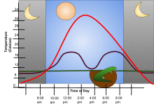 The red line represents the air temperature. The purple line represents the body temperature of the lizard. The green line represents the base temperature of the burrow. Lizards are ectotherms and use behavioral adaptations to control their temperature. They regulate their behavior based on the temperature outside; if it is warm they will go outside up to a point and return to their burrow as necessary.