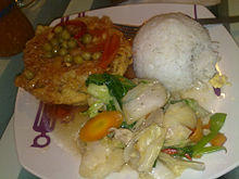 Egg foo young (Chinese: 芙蓉蛋; pinyin: fúróngdàn; Jyutping: fu4 'jung4 daan6*2, also spelled egg fooyung, egg foo yong, egg foo yung, or egg fu yung) is an omelette dish found in Chinese Indonesian, British Chinese,[1] and Chinese American cuisine.[2][3] The name comes from the Cantonese language. Egg foo young is derived from fu yung egg slices, a mainland Chinese recipe from Guangdong.