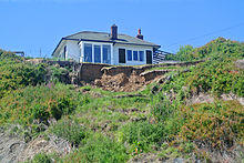 Thermal erosion is the result of melting and weakening permafrost due to moving water.[23] It can occur both along rivers and at the coast. Rapid river channel migration observed in the Lena River of Siberia is due to thermal erosion, as these portions of the banks are composed of permafrost-cemented non-cohesive materials.[24] Much of this erosion occurs as the weakened banks fail in large slumps. Thermal erosion also affects the Arctic coast, where wave action and near-shore temperatures combine to undercut permafrost bluffs along the shoreline and cause them to fail. Annual erosion rates along a 100-kilometre (62-mile) segment of the Beaufort Sea shoreline averaged 5.6 metres (18 feet) per year from 1955 to 2002.[25]