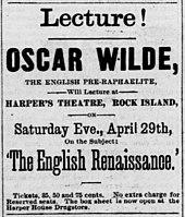 In 1882 Oscar Wilde visited Canada, where he toured the town of Woodstock, Ontario and gave a lecture on May 29 titled "The House Beautiful".[15] This particular lecture featured the early Aesthetic art movement, also known as the "Ornamental Aesthetic" art style, where local flora and fauna were celebrated as beautiful and textured, layered ceilings were popular. An example of this can be seen in Annandale National Historic Site, located in Tillsonburg, Ontario, Canada. The house was built in 1880 and decorated by Mary Ann Tillson, who happened to attend Oscar Wilde's lecture in Woodstock, and was influenced by it. Since the Aesthetic art movement was only prevalent from about 1880 until about 1890, there are not many surviving examples of this particular style but one such example is 18 Stafford Terrace, London, which provides an insight into how the middle classes interpreted the principles of Aesthetics. Olana, the home of Frederic Edwin Church in upstate New York, is an important example of exoticism in Aesthetic movement decorative arts.[16]