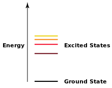 In quantum mechanics, an excited state of a system (such as an atom, molecule or nucleus) is any quantum state of the system that has a higher energy than the ground state (that is, more energy than the absolute minimum). Excitation is an elevation in energy level above an arbitrary baseline energy state. In physics there is a specific technical definition for energy level which is often associated with an atom being raised to an excited state. The temperature of a group of particles is indicative of the level of excitation (with the notable exception of systems that exhibit negative temperature).
