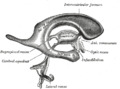 Drawing of a cast of the ventricular cavities, viewed from above. (Fourth ventricle visible at bottom center.) | |