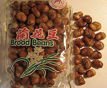 Broad beans, called Soramame (Japanese:そら豆) lit: “Sky Bean”, are consumed in a variety of ways in Japan. Most commonly, the beans are boiled and are eaten straight or added to rice. It is also consumed as a popular snack called “ikarimame” (Japanese:いかり豆) lit: “Anchor Bean”, where the beans are roasted or fried.[13]