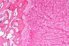 Micrograph showing fibrous dysplasia with the characteristic thin, irregular (Chinese character-like) bony trabeculae and fibrotic marrow space. H&E stain. | |