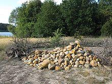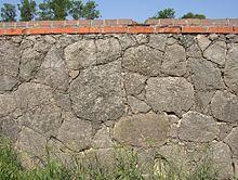 Fieldstone is a naturally occurring type of stone, which lies at or near the surface of the Earth. Fieldstone is a nuisance for farmers seeking to expand their land under cultivation, but at some point it began to be used as a construction material.[1][2][3] Strictly speaking, it is stone collected from the surface of fields where it occurs naturally. Collections of fieldstones which have been removed from arable land or pasture to allow for more effective agriculture are called clearance cairns.