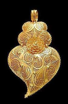 In Portugal, filigree dates back to the Celts.[7] Filigree works of the 17th and 18th centuries became famous for their extraordinary complexity.[8] Gold and silver filigree jewelry of delicate and artistic design is still made in considerable quantities throughout the country, particularly filigree hearts are iconic of Portuguese jewelry-making.