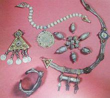 The museum of the Hermitage at Saint Petersburg contains a large collection of Scythian jewelry from the tombs of the Crimea. Many bracelets and necklaces in that collection are made of twisted wire, some in as many as seven rows of plaiting, with clasps in the shape of heads of animals of beaten work. Others are strings of large beads of gold, decorated with volutes, knots and other patterns of wire soldered over the surfaces.[4] In the British Museum a sceptre, probably that of a Greek priestess, is covered with plaited and netted gold wipe, finished with a sort of Corinthian capital and a boss of green glass.
