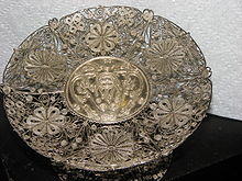 Cuttack, of the eastern Indian state Odisha, features traditional filigree work Known as tarakasi in the Odia language, most filigree work revolves around images of deities, though due to lack of patronage and modern design ideas, it is a dying art. Also noted is silver filigree of Karimnagar in Telangana state.[5]