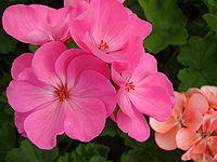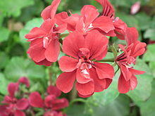 Pelargonium × hortorum, (also called zonal geranium,[2][3] garden geranium), is a nothospecies of Pelargonium most commonly used as an ornamental plant. It is a hybrid between Pelargonium zonale and Pelargonium inquinans. They are the group of Pelargonium cultivars, with leaves marked with a brown annular zone and inflorescence in the form of large balls of tight flowers, usually red, pink or white. These are the most common geraniums of garden centers and florists, sold in pots for windowsills and balconies or planted in flowerbeds.