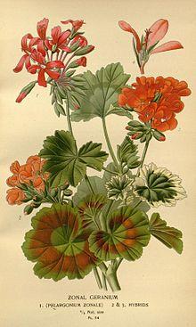 The ancestors of Pelargonium zonal group are two species of wild pelargoniums of South Africa called Geranium Africanum. In the following century, Carl Linnaeus gave them a binomial name, Geranium zonal and Geranium inquinans (in Species Plantarum 7 , 1735), then the heir reclassified them in the genus Pelargonium. But this name will only be widely accepted in the 19th century, and in the meantime varieties and horticultural hybrids of these species were a great success with gardeners, they kept the habit they had taken to call them "geraniums", a term that was unambiguously in context.