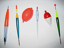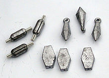 A sinker or plummet is a weight used when angling to force the lure or bait to sink more rapidly or to increase the distance that it may be cast. The ordinary plain sinker is traditionally made of lead. It can be practically any shape, and is often shaped round like a pipe-stem, with a swelling in the middle. However, the use of smaller lead based fishing sinkers has now been banned in the UK, Canada and some states in the US,[4] since lead can cause toxic lead poisoning if ingested. There are loops of brass wire on either end of the sinker to attach the line. Weights can range from a quarter of an ounce for trout fishing up to a couple of pounds or more for sea bass and menhaden.