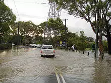 A flash flood is a rapid flooding of low-lying areas: washes, rivers, dry lakes and depressions. It may be caused by heavy rain associated with a severe thunderstorm, hurricane, tropical storm, or meltwater from ice or snow flowing over ice sheets or snowfields. Flash floods may also occur after the collapse of a natural ice or debris dam, or a human structure such as a man-made dam, as occurred before the Johnstown Flood of 1889. Flash floods are distinguished from regular floods by having a timescale of fewer than six hours between rainfall and the onset of flooding.[1] The water that is temporarily available is sometimes used by certain plants for growth.[2] However, plants that thrive in drier areas can be harmed by flooding, as the plants can become stressed by the large amount of water.[2]