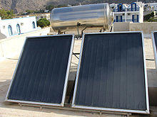 A solar thermal collector collects heat by absorbing sunlight. The term "solar collector" commonly refers to a device for solar hot water heating, but may refer to large power generating installations such as solar parabolic troughs and solar towers or non water heating devices such as solar air heaters.[1]