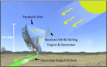 Losses due to atmospheric scattering are generally minimal. However, on a hazy or foggy day, light is diffused in all directions through the atmosphere, which significantly reduces the efficiency of a parabolic dish. In dish stirling power plant designs, a stirling engine coupled to a dynamo is placed at the focus of the dish. This absorbs the energy focused onto it and converts it into electricity.