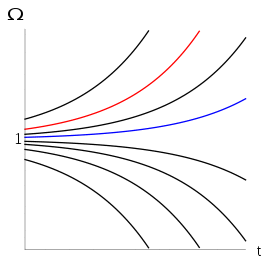 Thus if initially takes any arbitrary value, a period of inflation can force it down towards 0 and leave it extremely small - around as required above, for example. Subsequent evolution of the universe will cause the value to grow, bringing it to the currently observed value of around 0.01. Thus the sensitive dependence on the initial value of Ω has been removed: a large and therefore 'unsurprising' starting value need not become amplified and lead to a very curved universe with no opportunity to form galaxies and other structures.