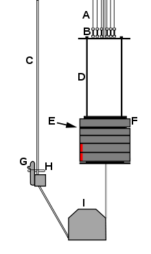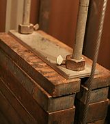 Spreader plates are thin steel plates with holes through which the arbor connecting rods pass. Spreader plates are lowered onto the counterweights in a distributed fashion as the counterweight stack is being built. Typically one spreader plate is placed on top of every two feet of counterweight in the stack. Finally, a locking plate is lowered onto the completed, interleaved stack of counterweights and spreader plates and secured in place with a thumbscrew.