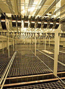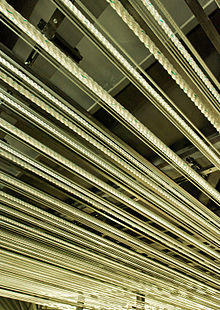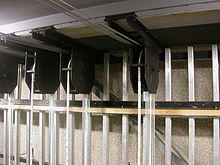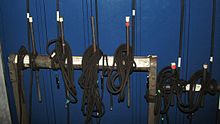 Electrical line sets, commonly called electrics, are used to suspend and control lighting instruments and, in many cases, microphones and special effects equipment as well. Electrics may be temporarily "wired" with drop boxes (electrical boxes with outlets) or multicable fanouts dropped from the grid or draped from a fly gallery, or permanently wired with connector strips (specialized electrical raceways).[2]