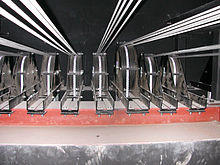 Yo-yo, pile-up, or pilewind, hoists use yo-yo type devices instead of helically grooved drums. The yo-yos lines are coiled into overlapping layers of cable in the narrow slots. The pile-up drum hoists are usually used in low load. As the hoists are narrower than helically grooved drum hoists, these can be used in the places with limited space.[7] Pile-up drum hoists can be mounted in many locations including ceiling, floor or wall mounting. Typical applications are to have a pile-up drum hoist with many pulleys to control a batten.[8] Since the line is piled up on itself, this type of drum hoist provides a zero fleet angle solution.[9]