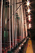 The top of the arbor is permanently suspended by several wire rope lift lines, made of galvanized steel aircraft cable (GAC). The lift lines run from the top of the arbor up to the top of the fly tower, around the head block, across the stage to evenly spaced loft blocks, then down, terminating at the batten, a load-bearing pipe that spans much of the width of the stage.