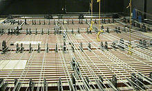 The grid deck, gridiron deck, or grid, is a permeable working surface present at the top of many fly lofts that is used to support and provide access to many of a rigging system's components. Though originally constructed of wood, down-facing three-inch steel channels with three-inch gaps became the prevalent grid decking in the 20th century. Today, large-opening heavy-duty steel bar grating is most common in new theatres. The grid deck surface is usually rated to support live loads as well as all anticipated dead-hung equipment and hemp and motorized (e.g., chain hoist) spot rigging. Its permeability facilitates the mounting of equipment and the passing of lift lines and electrical cables. Spot rigging is not feasible without a grid.