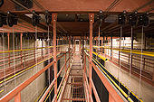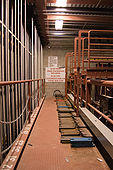 Specific to a stage house using a counterweight system, the loading bridge, or loading gallery, is a catwalk vertically positioned below the headlock beam, and above the fly gallery. The loading bridge is used to add or remove counterweights from arbors. The floor of the loading bridge is also typically used as a storage area for uncommitted counterweights that are available for loading onto counterweight arbors. Stage houses with especially tall fly towers, or double-purchase systems, may have two loading bridges, one stacked over the other to facilitate the loading of relatively tall arbors.
