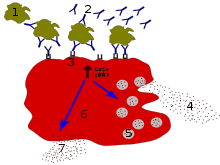 If later exposure to the same allergen occurs, the allergen can bind to the IgE molecules held on the surface of the mast cells or basophils. Cross-linking of the IgE and Fc receptors occurs when more than one IgE-receptor complex interacts with the same allergenic molecule, and activates the sensitized cell. Activated mast cells and basophils undergo a process called degranulation, during which they release histamine and other inflammatory chemical mediators (cytokines, interleukins, leukotrienes, and prostaglandins) from their granules into the surrounding tissue causing several systemic effects, such as vasodilation, mucous secretion, nerve stimulation, and smooth-muscle contraction. This results in rhinorrhea, itchiness, dyspnea, and anaphylaxis. Depending on the individual, the allergen, and the mode of introduction, the symptoms can be system-wide (classical anaphylaxis), or localized to particular body systems.[39]