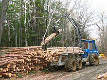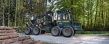 A forwarder is a forestry vehicle that carries big felled logs from the stump to a roadside landing. Unlike a skidder, a forwarder carries logs clear of the ground, which can reduce soil impacts but tends to limit the size of the logs it can move. Forwarders are typically employed together with harvesters in cut-to-length logging operations.