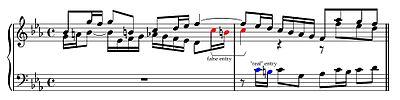 At any point in the fugue there may be "false entries" of the subject, which include the start of the subject but are not completed. False entries are often abbreviated to the head of the subject, and anticipate the "true" entry of the subject, heightening the impact of the subject proper.[17]