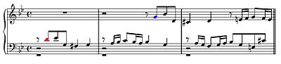 The excerpt below, bars 7–12 of J. S. Bach's Fugue no. 2 in C minor, BWV 847, from the Well-Tempered Clavier, Book 1 illustrates the application of most of the characteristics described above. The fugue is for keyboard and in three voices, with regular countersubjects.[7][27] This excerpt opens at last entry of the exposition: the subject is sounding in the bass, the first countersubject in the treble, while the middle-voice is stating a second version of the second countersubject, which concludes with the characteristic rhythm of the subject, and is always used together with the first version of the second countersubject. Following this an episode modulates from the tonic to the relative major by means of sequence, in the form of an accompanied canon at the fourth.[24] Arrival in E-flat major is marked by a quasi perfect cadence across the barline, from the last quarter note beat of the first bar to the first beat of the second bar in the second system, and the first middle entry. Here Bach has altered countersubject 2 to accommodate the change of mode.[28]