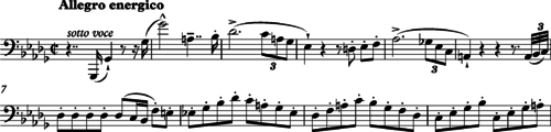 The first answer must occur as soon after the initial statement of the subject as possible; therefore the first codetta is often extremely short, or not needed. In the above example this is the case: the subject finishes on the quarter note (or crotchet) B-flat of the third beat of the second bar which harmonizes the opening G of the answer. The later codettas may be considerably longer, and often serve to (a) develop the material heard so far in the subject/answer and countersubject and possibly introduce ideas heard in the second countersubject or free counterpoint that follows (b) delay, and therefore heighten the impact of the reentry of the subject in another voice as well as modulating back to the tonic.[23]