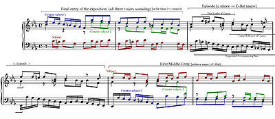 The counter-exposition is a second exposition. However, there are only two entries, and the entries occur in reverse order.[29] The counter-exposition in a fugue is separated from the exposition by an episode, and is in the same key as the original exposition.[29]