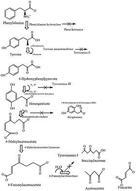 - ^ a b Sniderman King L, Trahms C, Scott CR (July 2006). "Tyrosinemia Type I". In Adam MP, Ardinger HH, Pagon RA, Wallace SE, Bean LJ, Stephens K, Amemiya A (eds.). GeneReviews. Seattle: University of Washington. PMID 20301688.