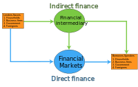 In economics funds are injected into the market as capital by lenders and taken as loans by borrowers. There are two ways in which the capital can end up at the borrower. The lender can lend the capital to a financial intermediary against interest. These financial intermediaries then reinvest the money against a higher rate. The use of financial intermediaries to finance operations is called indirect finance. A lender can also go the financial markets to directly lend to a borrower. This method is called direct finance.[2]