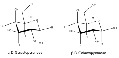 Four isomers are cyclic, two of them with a pyranose (six-membered) ring, two with a furanose (five-membered) ring. Galactofuranose occurs in bacteria, fungi and protozoa,[7][8] and is recognized by a putative chordate immune lectin intelectin through its exocyclic 1,2-diol. In the cyclic form there are two anomers, named alpha and beta, since the transition from the open-chain form to the cyclic form involves the creation of a new stereocenter at the site of the open-chain carbonyl. In the beta form, the alcohol group is in the equatorial position, whereas in the alpha form, the alcohol group is in the axial position.[9]