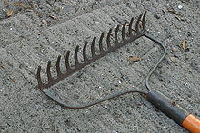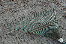 A rake (Old English raca, cognate with Dutch raak, German Rechen, from the root meaning "to scrape together", "heap up") is a broom for outside use; a horticultural implement consisting of a toothed bar fixed transversely to a handle, or tines fixed to a handle, and used to collect leaves, hay, grass, etc., and in gardening, for loosening the soil, light weeding and levelling, removing dead grass from lawns, and generally for purposes performed in agriculture by the harrow.[1]