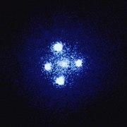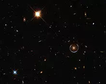 The deflection of light by gravity is responsible for a new class of astronomical phenomena. If a massive object is situated between the astronomer and a distant target object with appropriate mass and relative distances, the astronomer will see multiple distorted images of the target. Such effects are known as gravitational lensing.[106] Depending on the configuration, scale, and mass distribution, there can be two or more images, a bright ring known as an Einstein ring, or partial rings called arcs.[107] The earliest example was discovered in 1979;[108] since then, more than a hundred gravitational lenses have been observed.[109] Even if the multiple images are too close to each other to be resolved, the effect can still be measured, e.g., as an overall brightening of the target object; a number of such "microlensing events" have been observed.[110]