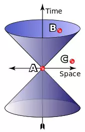 With Lorentz symmetry, additional structures come into play. They are defined by the set of light cones (see image). The light-cones define a causal structure: for each event A, there is a set of events that can, in principle, either influence or be influenced by A via signals or interactions that do not need to travel faster than light (such as event B in the image), and a set of events for which such an influence is impossible (such as event C in the image). These sets are observer-independent.[31] In conjunction with the world-lines of freely falling particles, the light-cones can be used to reconstruct the space–time's semi-Riemannian metric, at least up to a positive scalar factor. In mathematical terms, this defines a conformal structure[32] or conformal geometry.