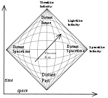 In general relativity, no material body can catch up with or overtake a light pulse. No influence from an event A can reach any other location X before light sent out at A to X. In consequence, an exploration of all light worldlines (null geodesics) yields key information about the spacetime's causal structure. This structure can be displayed using Penrose–Carter diagrams in which infinitely large regions of space and infinite time intervals are shrunk ("compactified") so as to fit onto a finite map, while light still travels along diagonals as in standard spacetime diagrams.[150]
