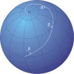 In navigation, a rhumb line or loxodrome is an arc crossing all meridians of longitude at the same angle. A rhumb line is not a spherical spiral. There is no simple connection between the angles and .