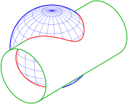 The diagram shows the case, where the intersection of a cylinder and a sphere consists of two circles. Would the cylinder radius be equal to the sphere's radius, the intersection would be one circle, where both surfaces are tangent.
