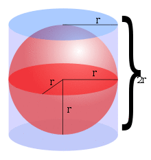 where r is the radius and d is the diameter of the sphere. Archimedes first derived this formula by showing that the volume inside a sphere is twice the volume between the sphere and the circumscribed cylinder of that sphere (having the height and diameter equal to the diameter of the sphere).[6] This may be proved by inscribing a cone upside down into semi-sphere, noting that the area of a cross section of the cone plus the area of a cross section of the sphere is the same as the area of the cross section of the circumscribing cylinder, and applying Cavalieri's principle.[7] This formula can also be derived using integral calculus, i.e. disk integration to sum the volumes of an infinite number of circular disks of infinitesimally small thickness stacked side by side and centered along the x-axis from x = −r to x = r, assuming the sphere of radius r is centered at the origin.