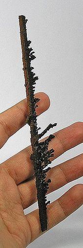 Goethite (/ˈɡɜːrtaɪt/[5]) is a mineral of the diaspore group, consisting of iron(III) oxide-hydroxide, specifically the "α" polymorph. It is found in soil and other low-temperature environments such as sediment. Goethite has been well known since ancient times for its use as a pigment (brown ochre). Evidence has been found of its use in paint pigment samples taken from the caves of Lascaux in France. It was first described in 1806 based on samples found in the Hollertszug Mine in Herdorf, Germany.[3] The mineral was named after the German polymath and poet Johann Wolfgang von Goethe (1749–1832).