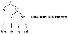 A generative parse tree: the sentence is divided into a noun phrase (subject), and a verb phrase which includes the object. This is in contrast to structural and functional grammar which consider the subject and object as equal constituents.[13][14]
